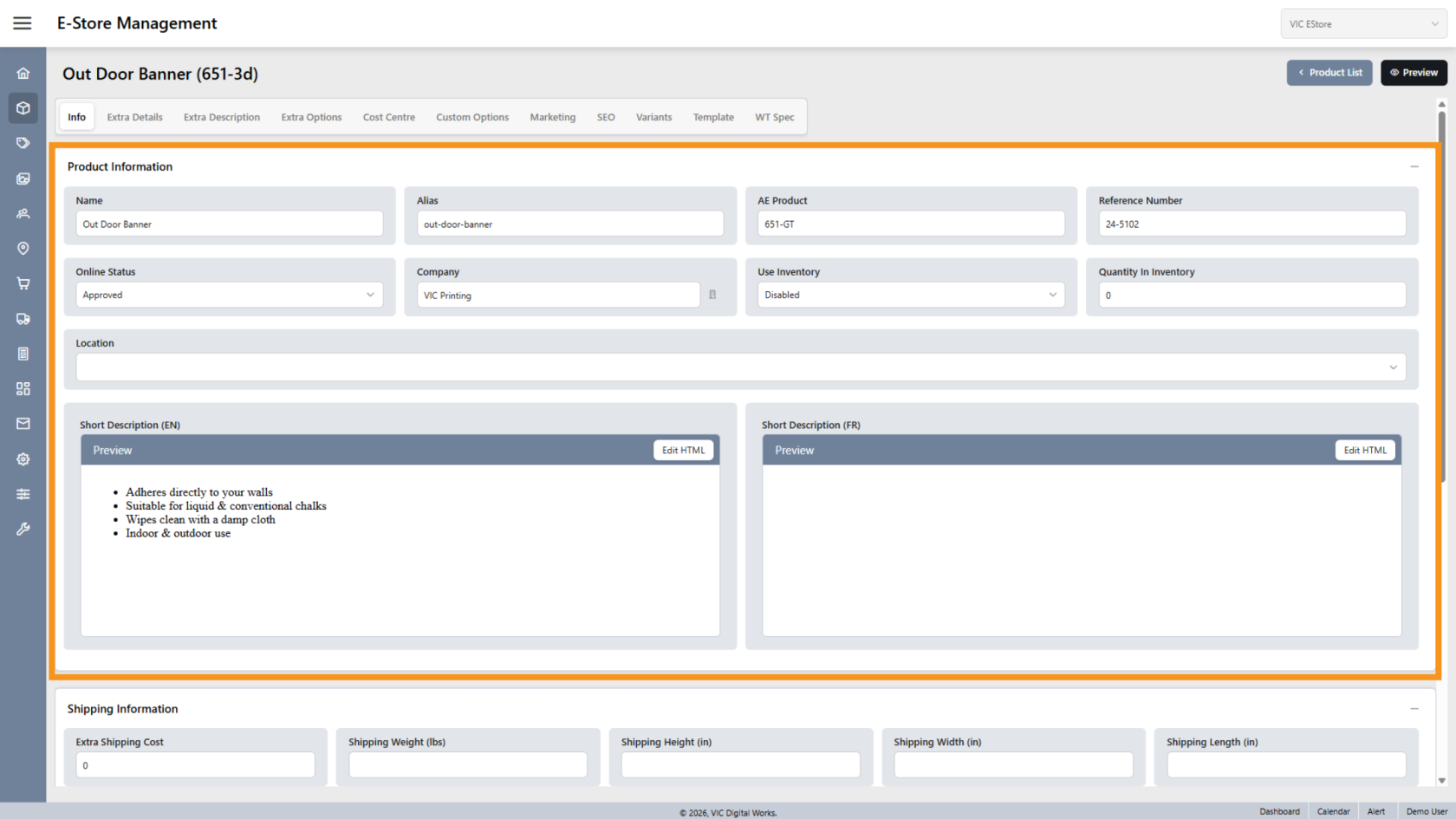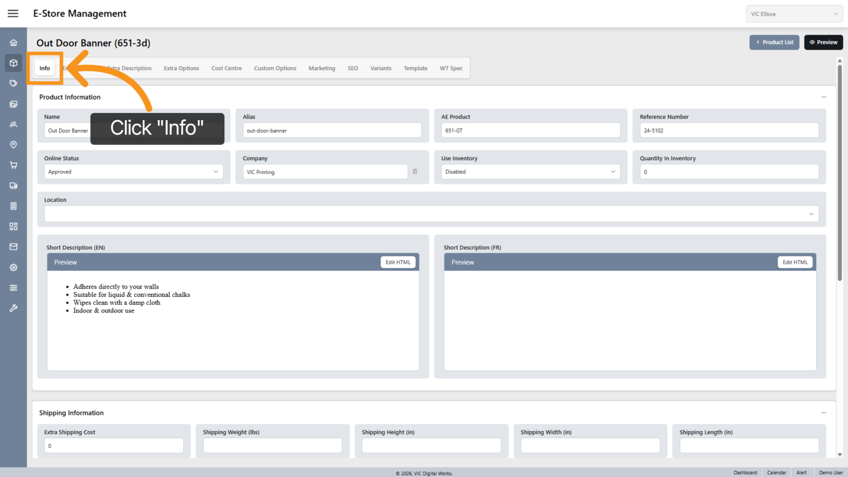 Click Description to update the product description shown in the E-Store.