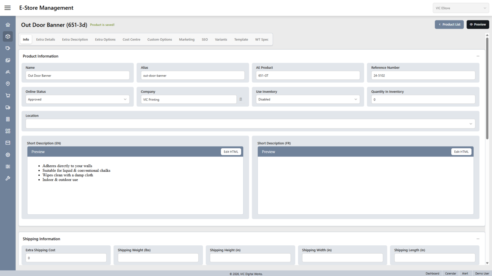 You have successfully created and configured a new E-Store product, including product details and images.