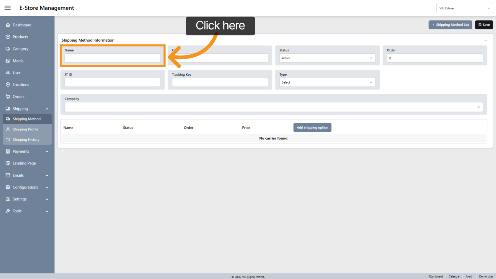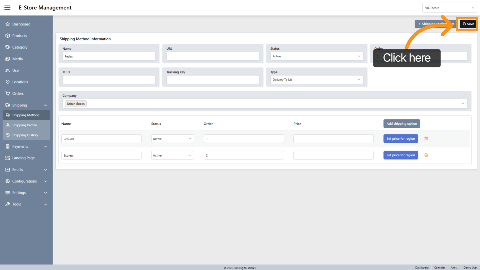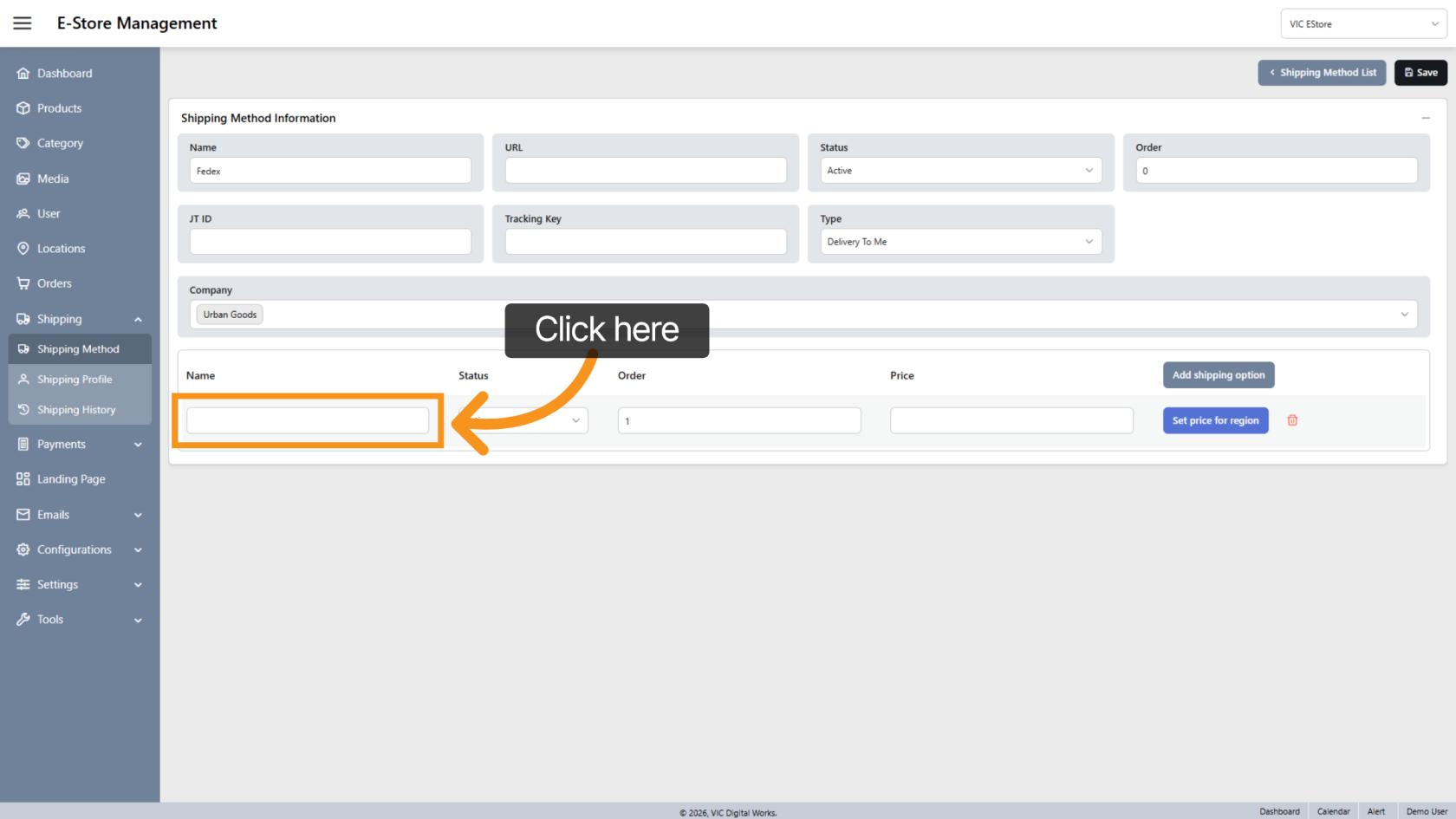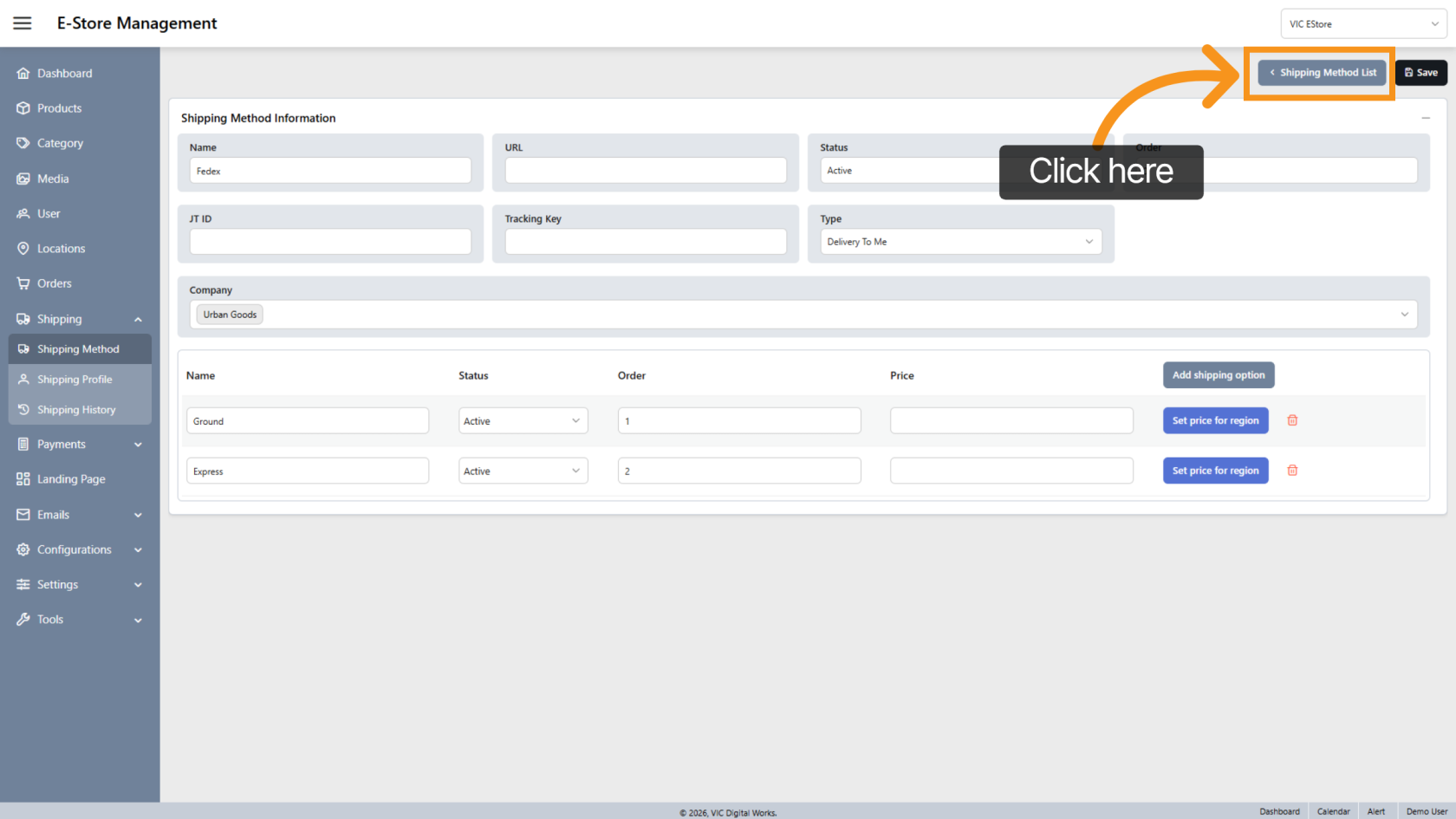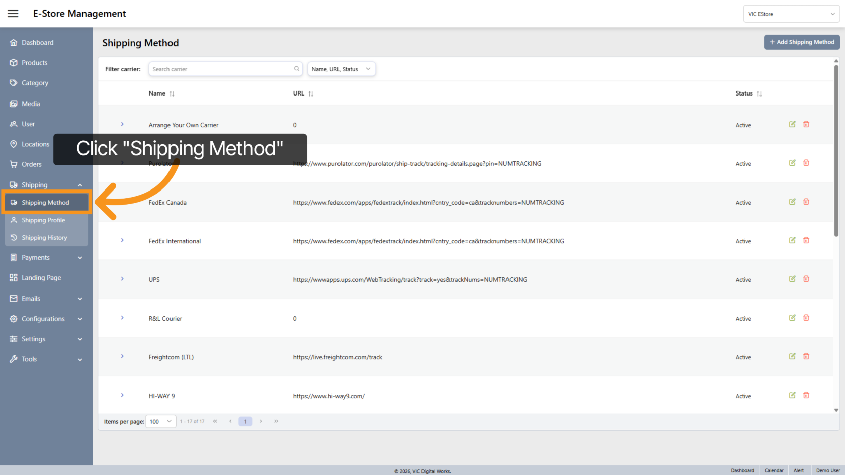 Click "Shipping Method" from the side menu to access the shipping management interface.