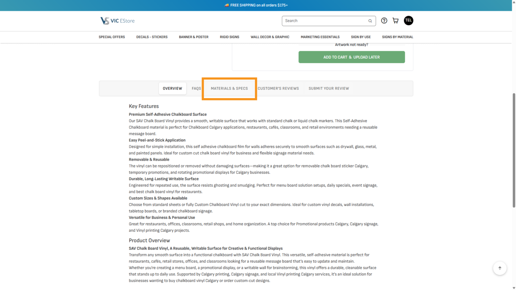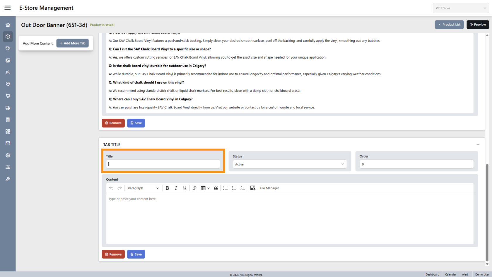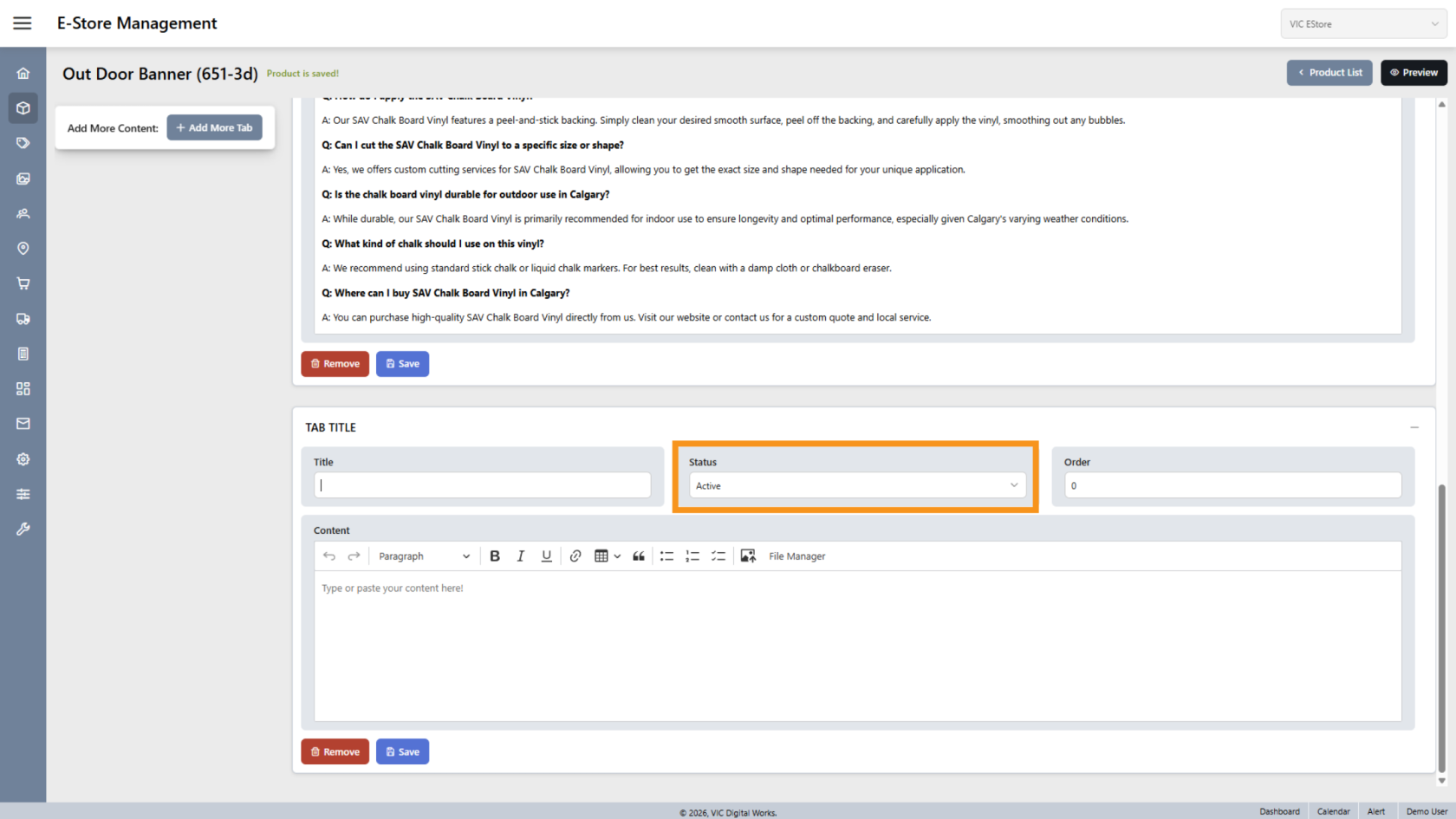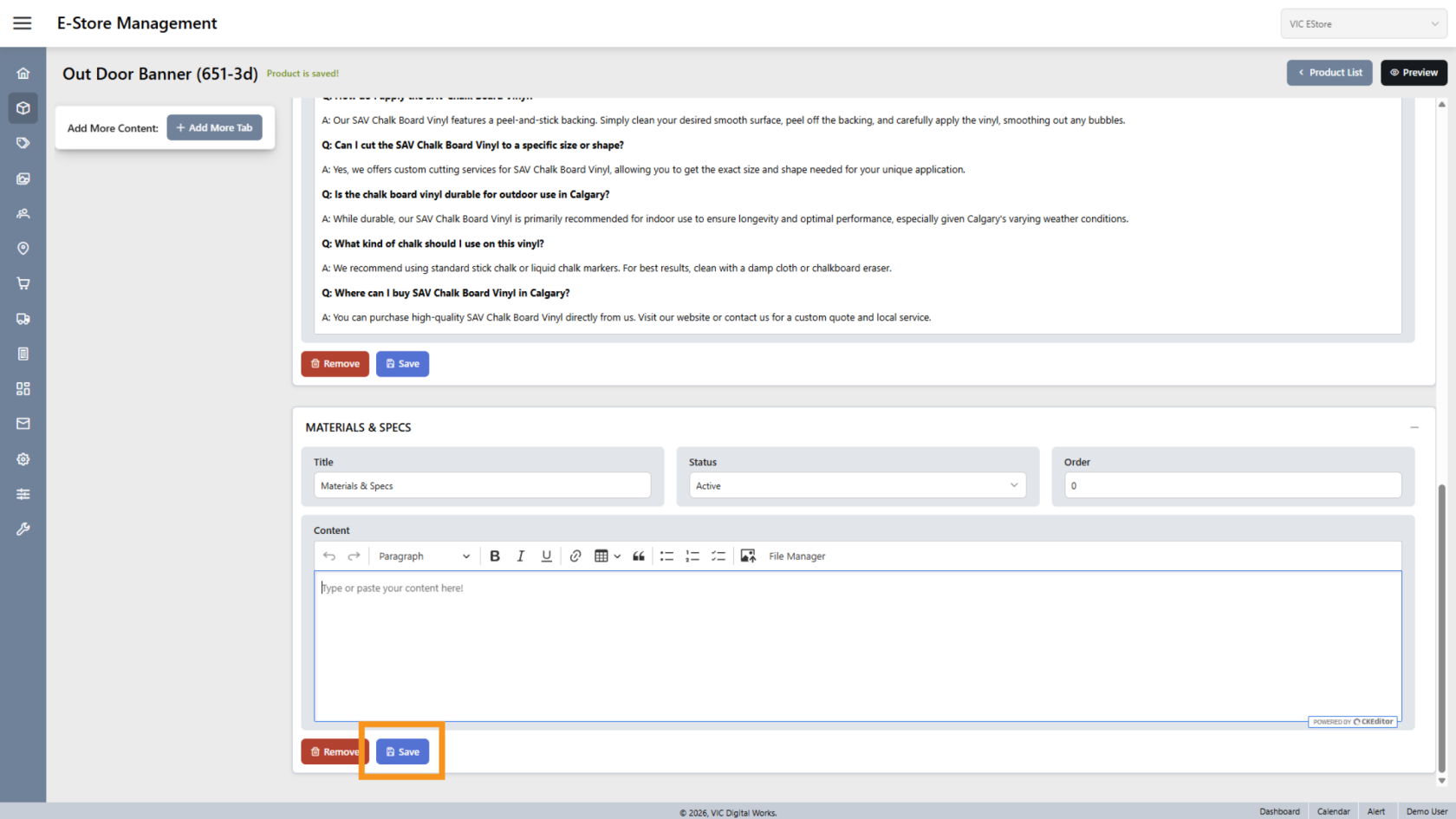 Scroll down the product detail page to confirm the new tab is displayed correctly in the E-Store.