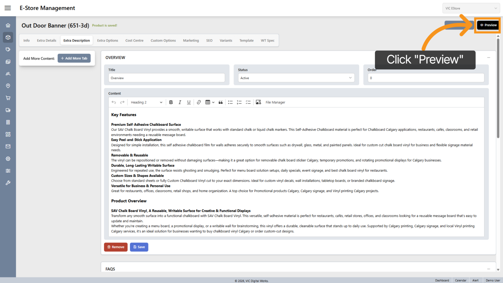 You have successfully configured and previewed the extra description content for your product. Review all tabs to ensure the information is accurate before updating other products.