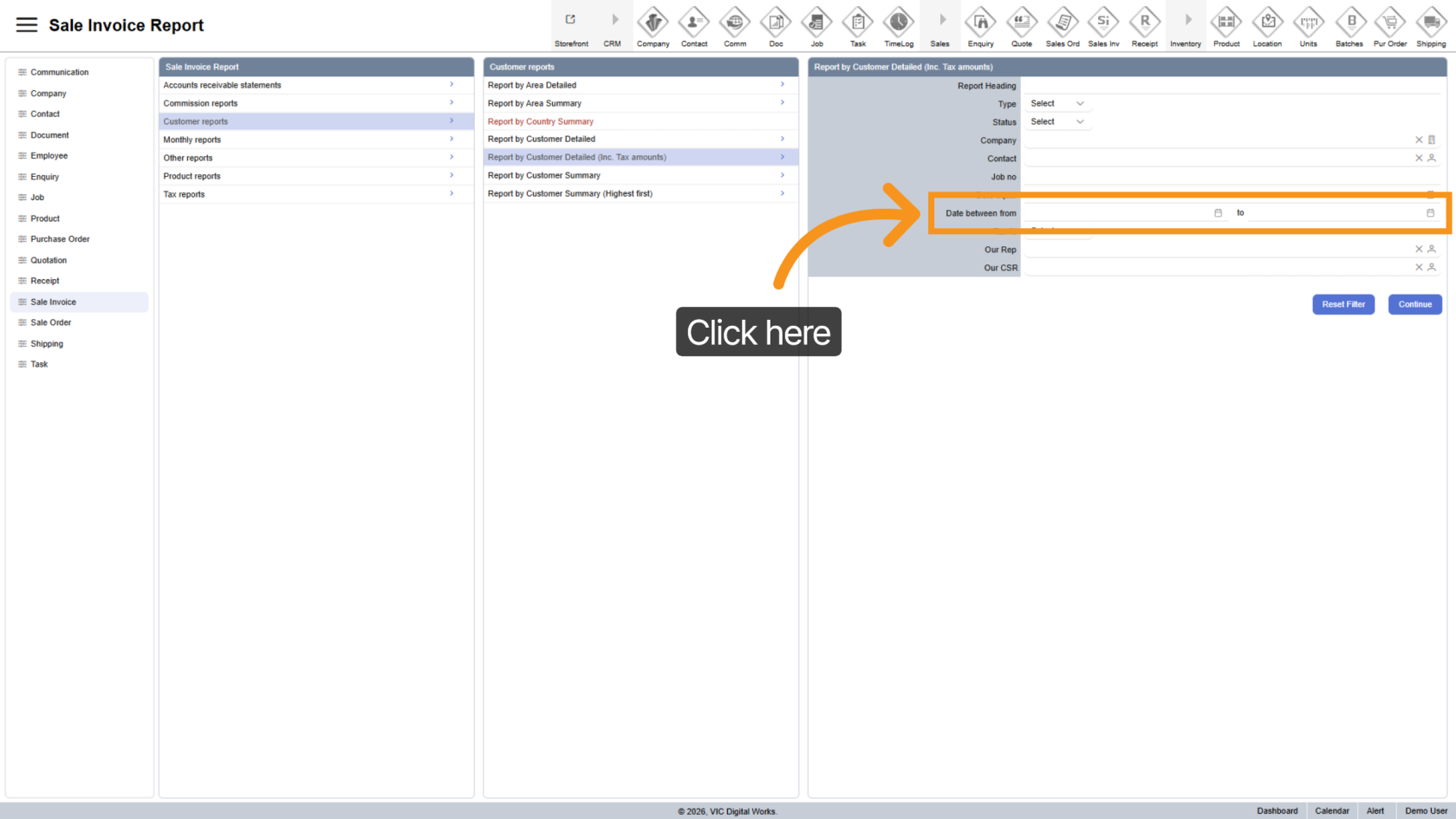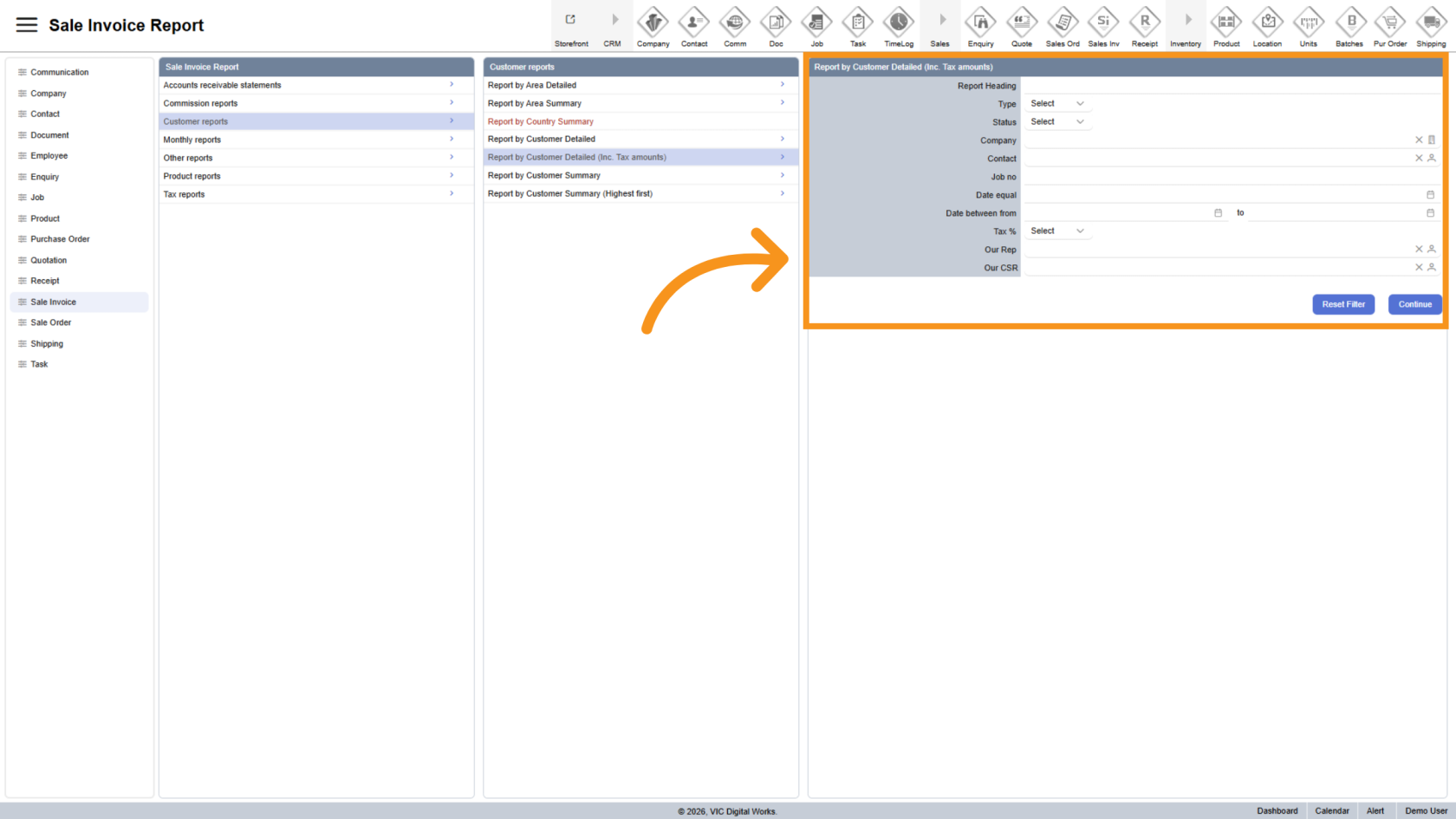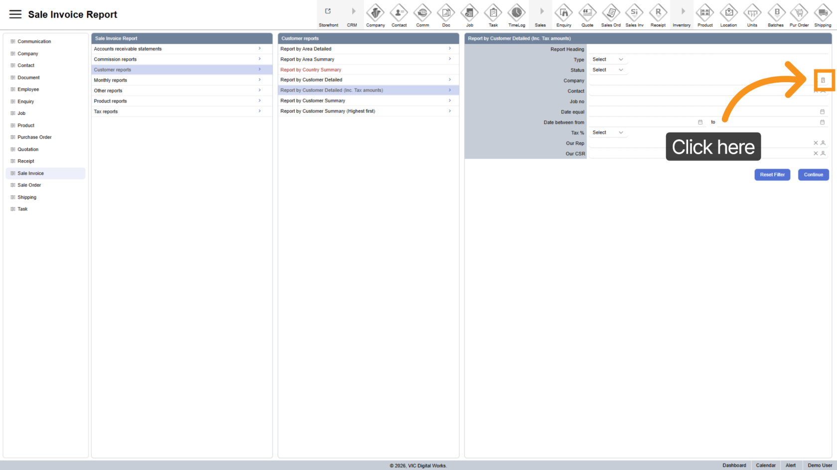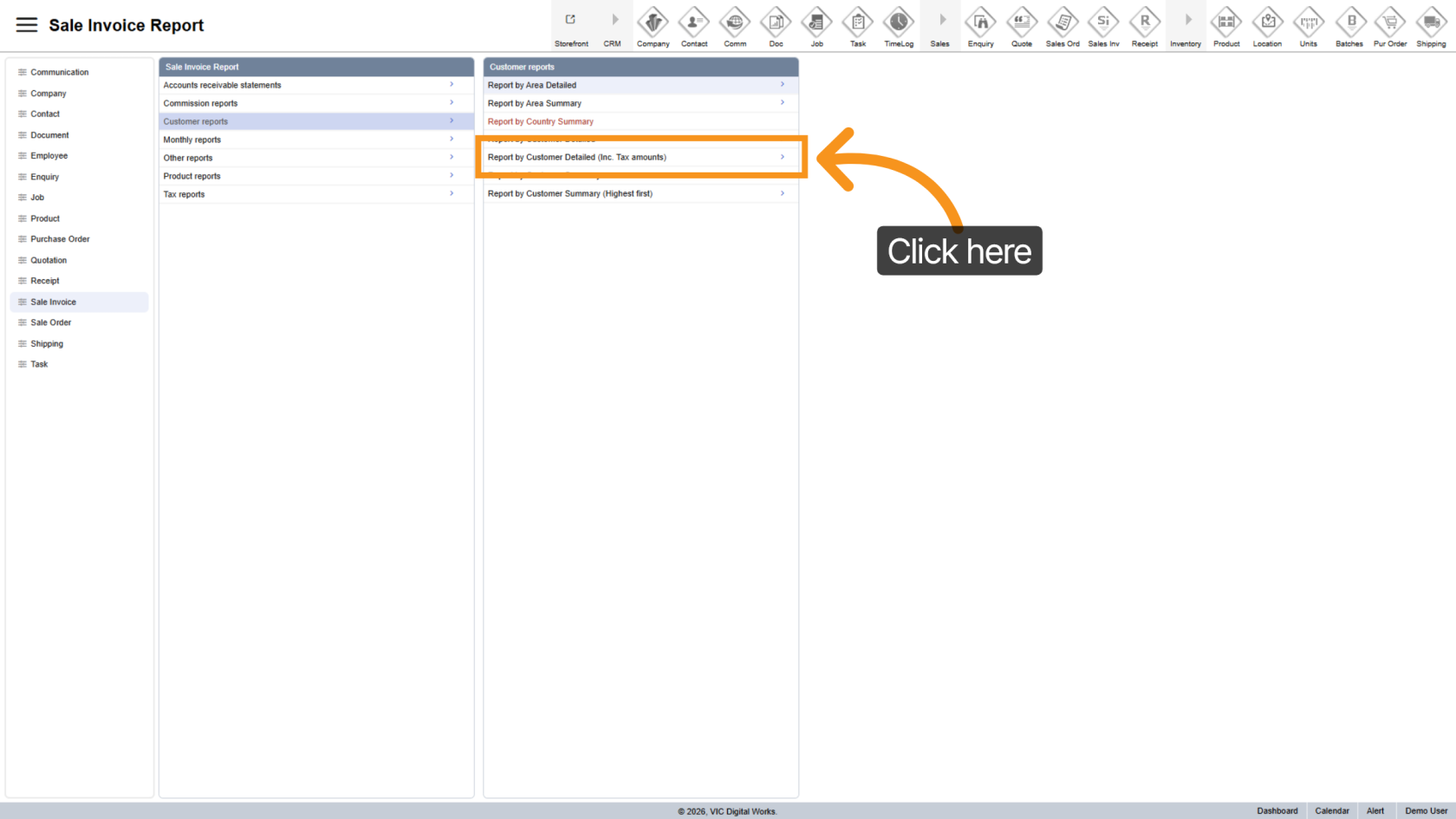 Click "Report by Customer Detailed (Inc. Tax amounts)" to open the report configuration panel.