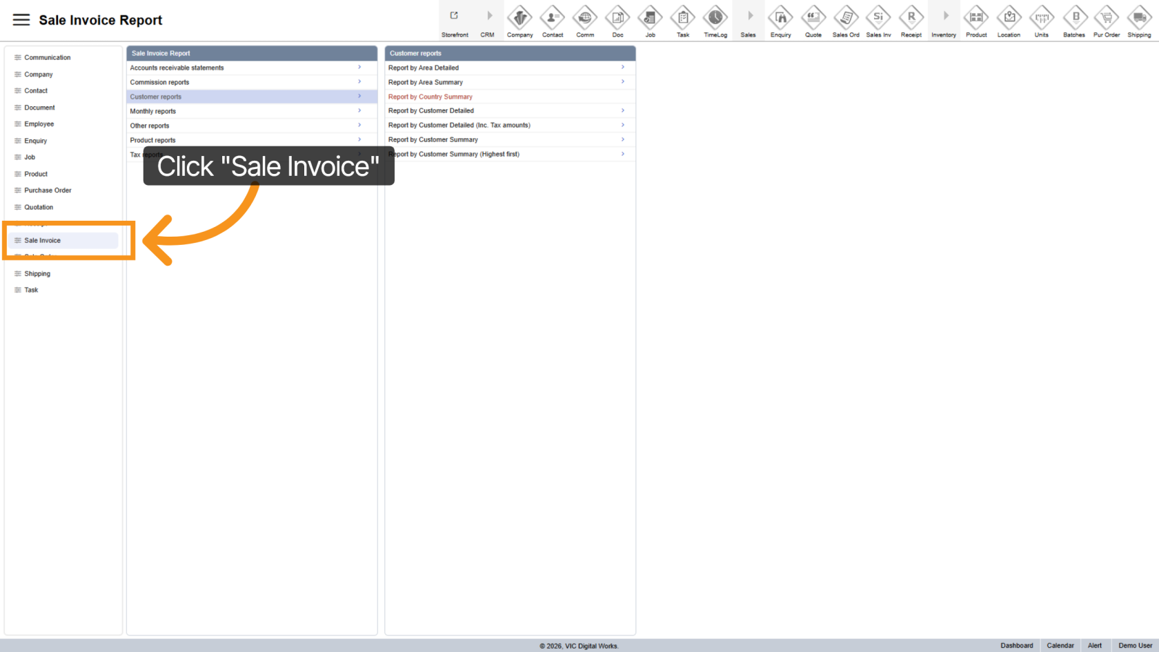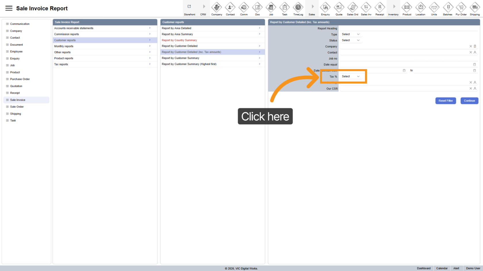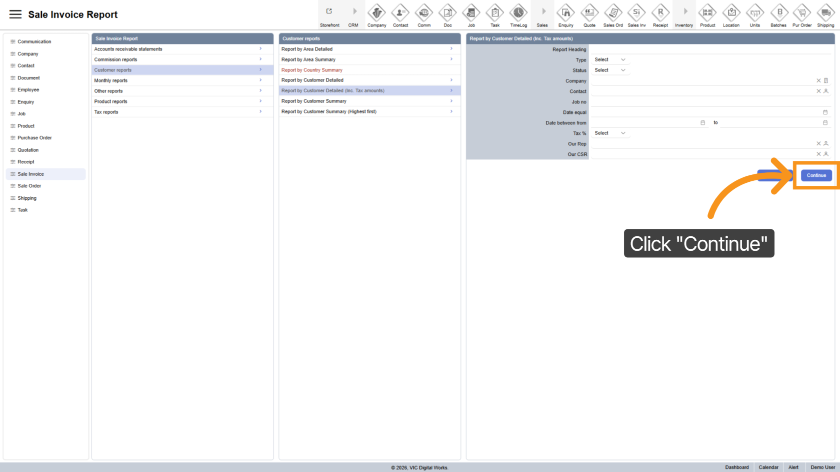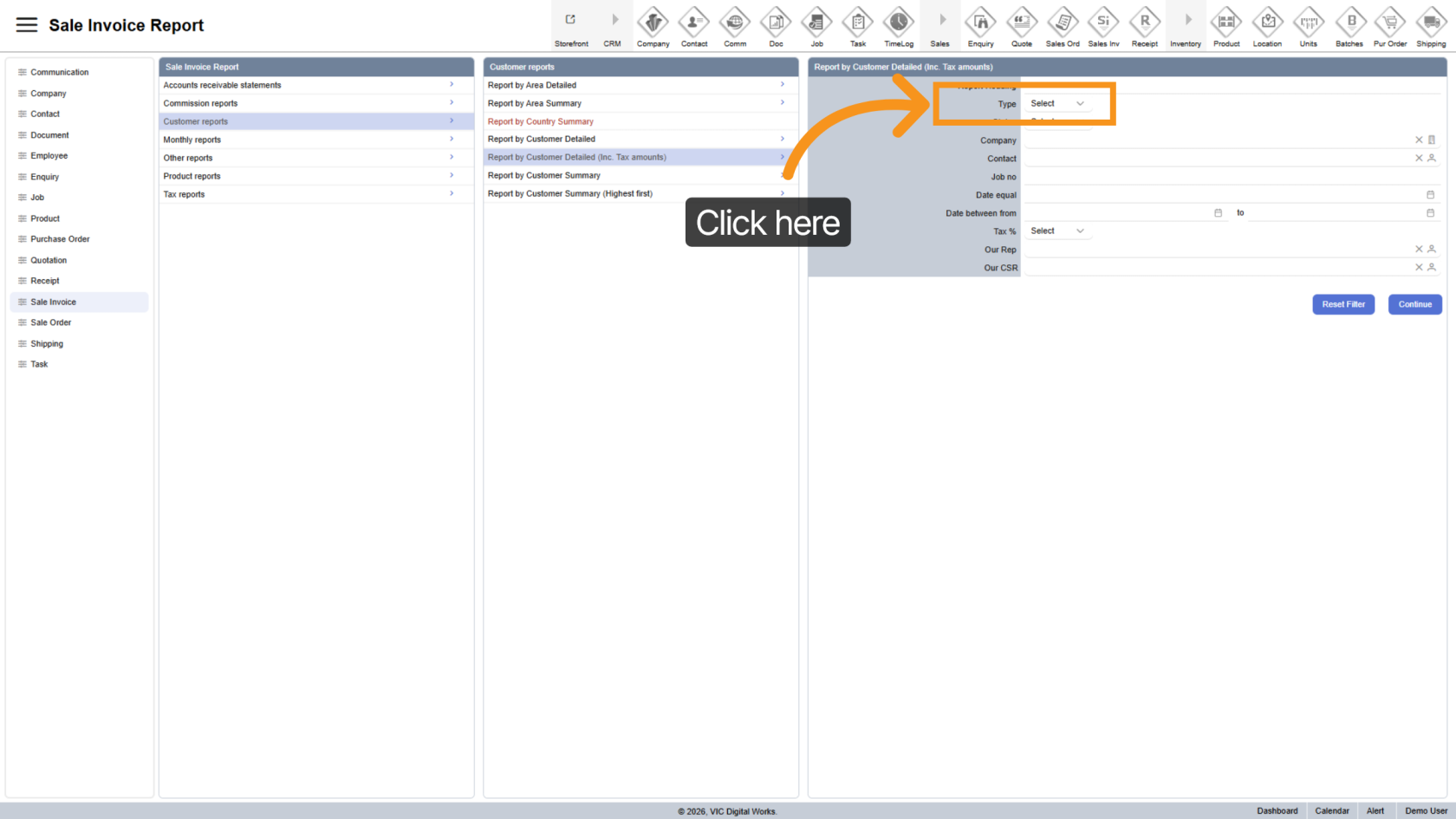 Click "Report by Customer Detailed (Inc. Tax amounts)" to open the report configuration panel.