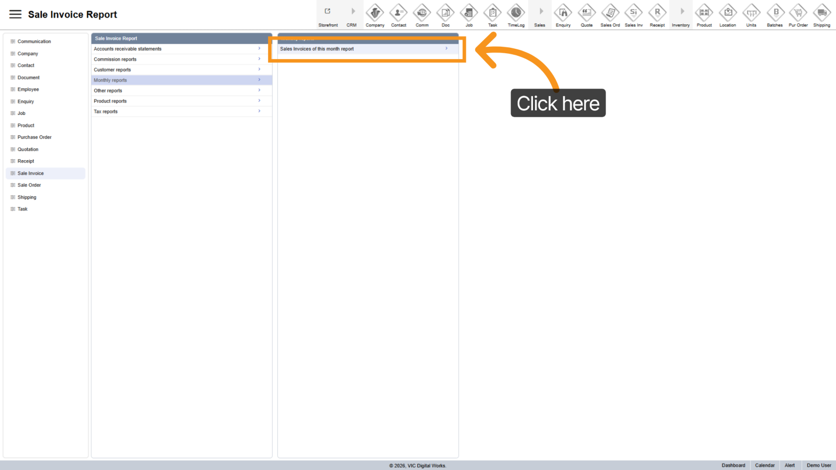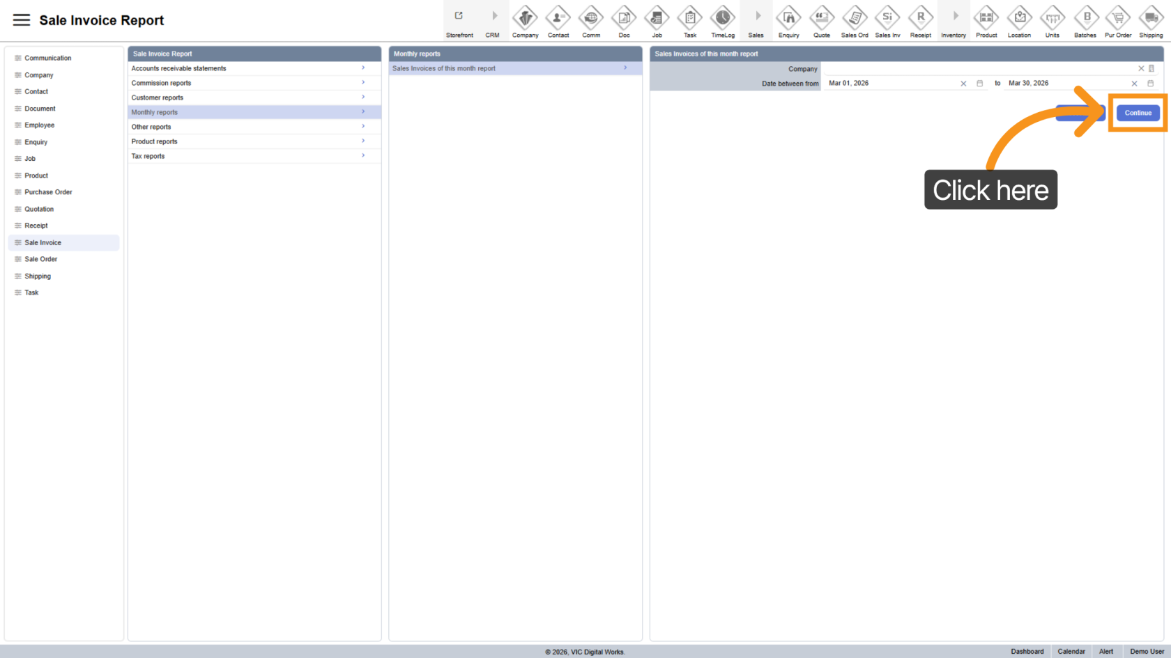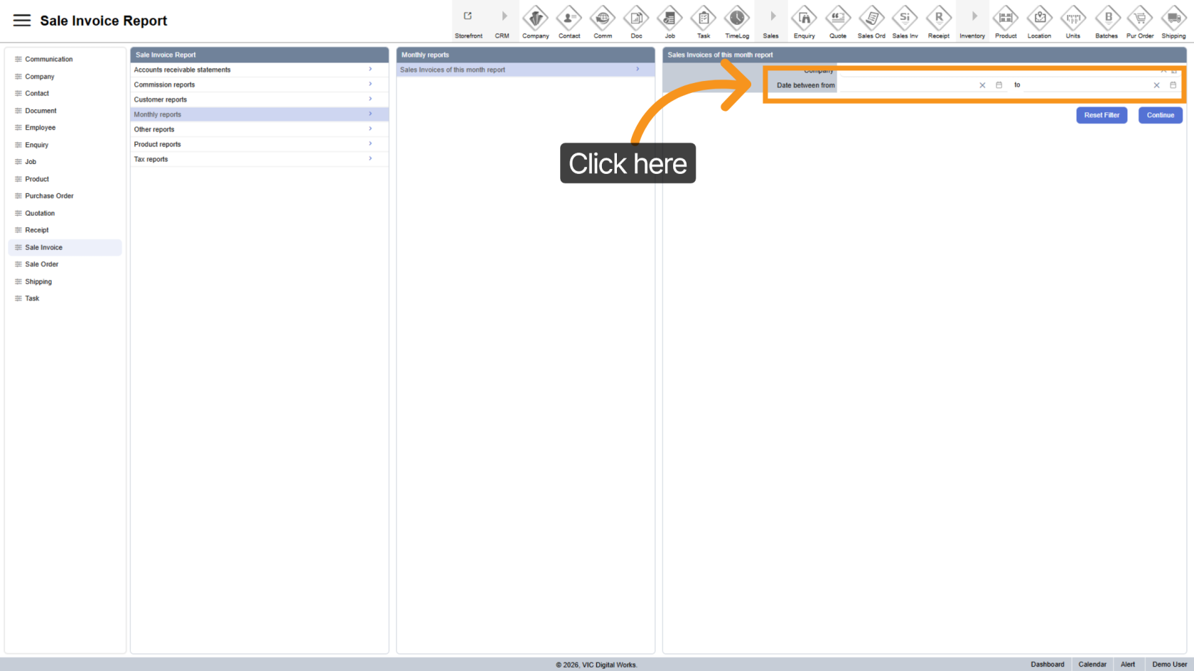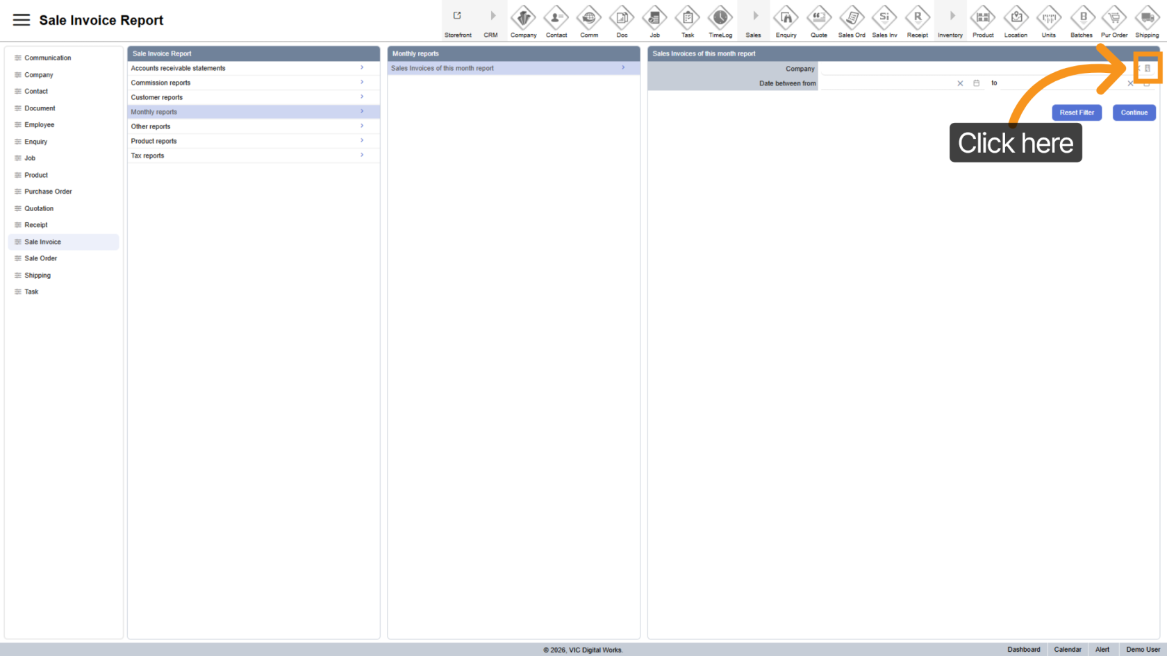Click "Sales Invoices of this month report" to open the report configuration panel