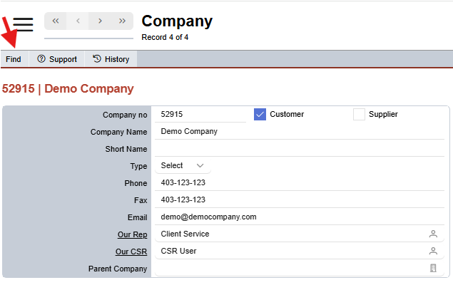 Click "Find" from the top menu to open the company find.
