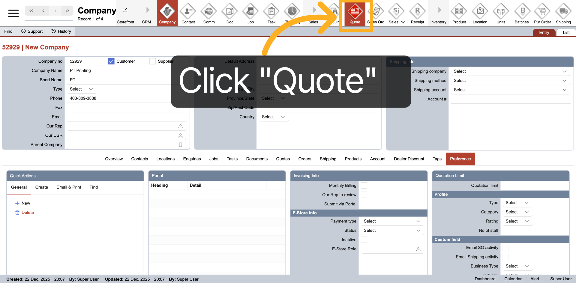 Select "Quote" from the top main menu to view the quotation.