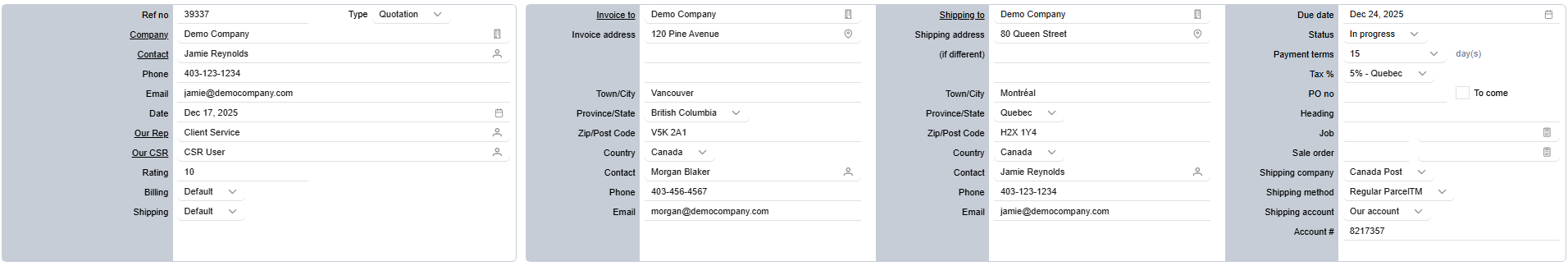 plus icon located in the quotes header. - All details — including Company, Contact, Billing, Shipping, and Tax (based on the Shipping Address) — will be automatically filled according to the company setup.