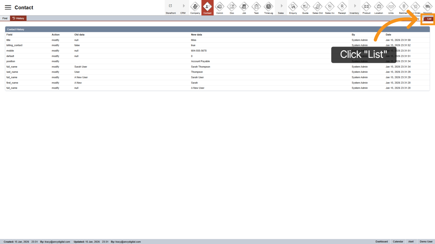 Click on "History" to view the changes or activity logs associated with the current contact.