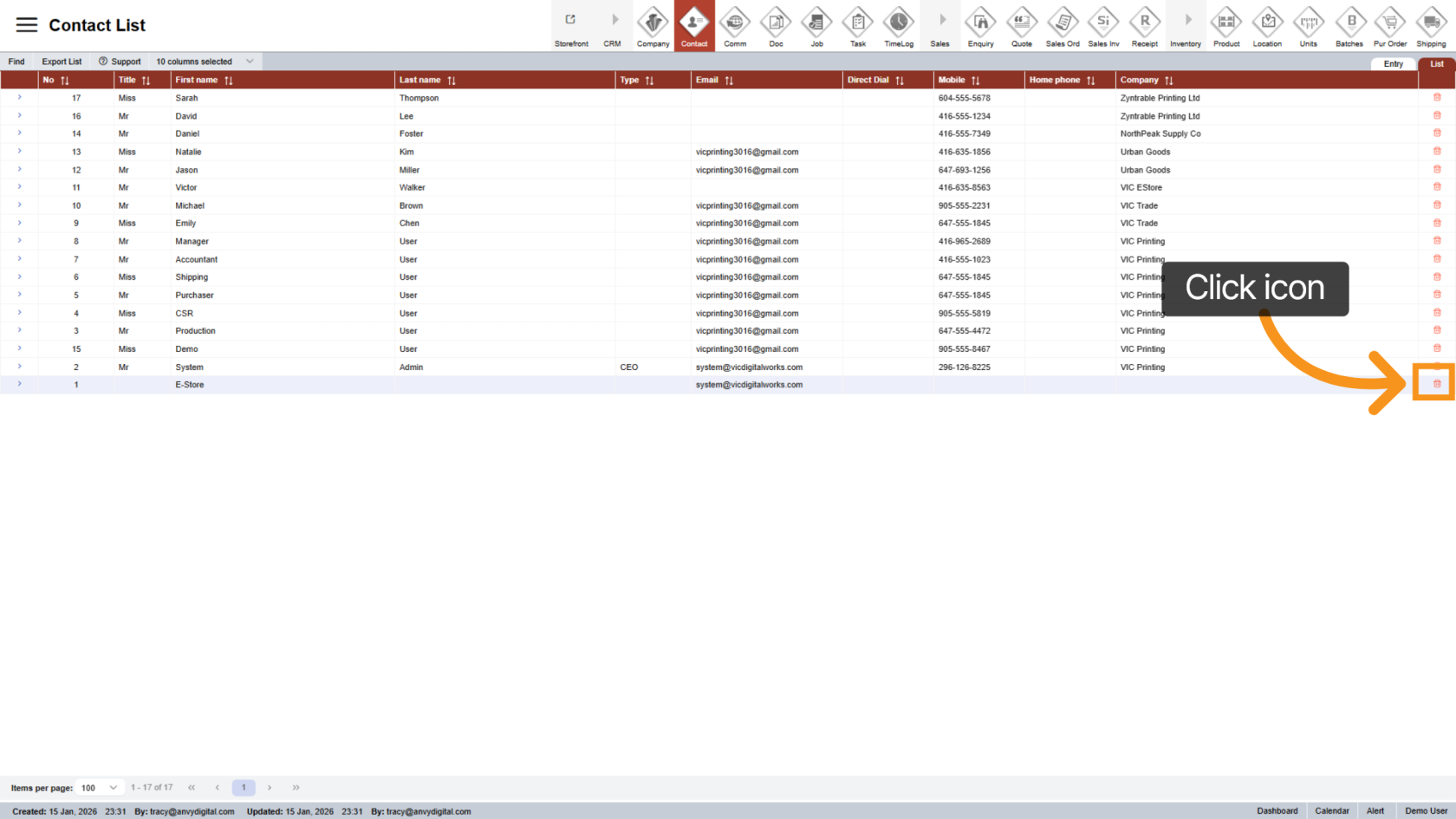 You can delete a contact by clicking the "Delete" icon next to the contact you want to remove.
