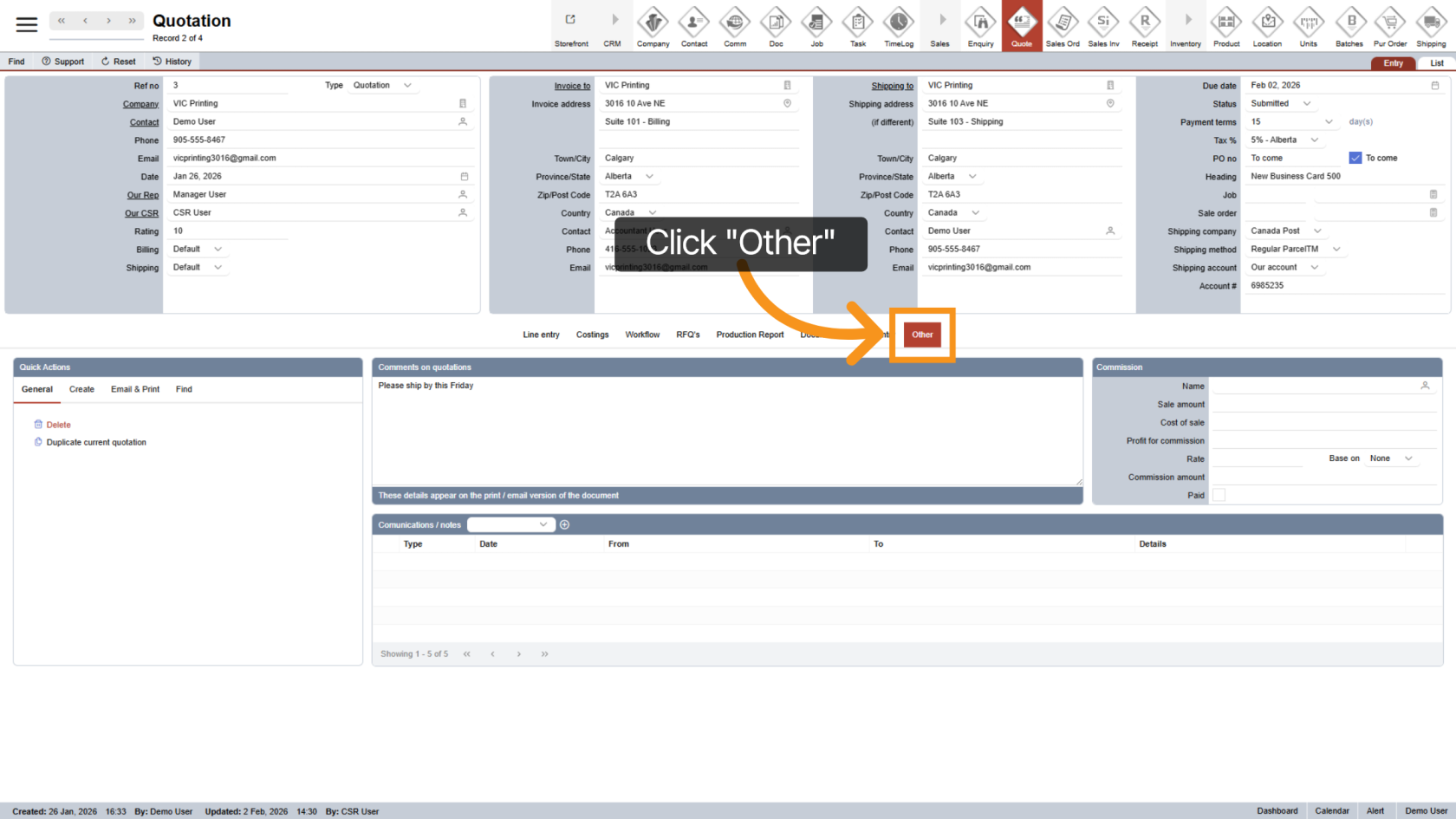 Once the quotation is open, click "Other" in the middle menu.