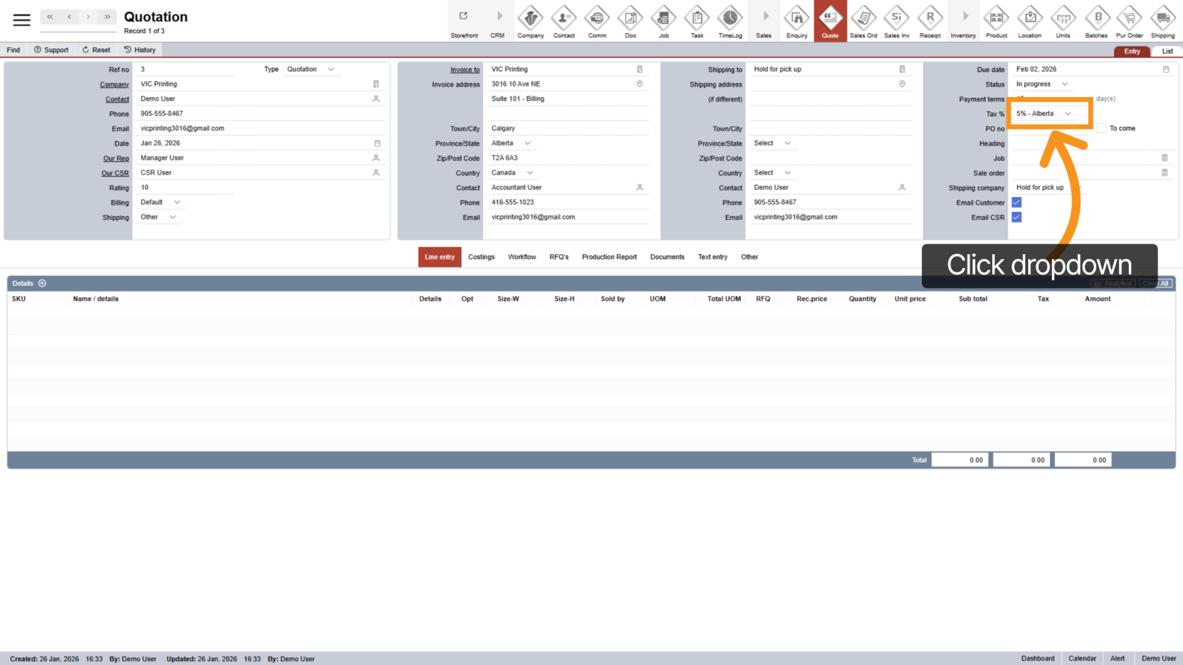 The tax rate is automatically calculated based on the shipping address. Click the Tax % dropdown if you need to adjust it.