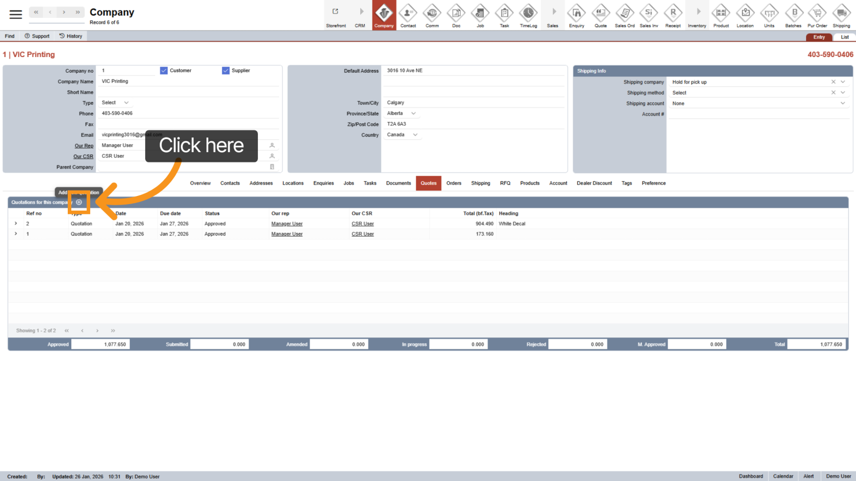 From the middle menu, click "Quotes" to open the quotation management area for the selected company. (Learn more about selecting a company in Find Company)