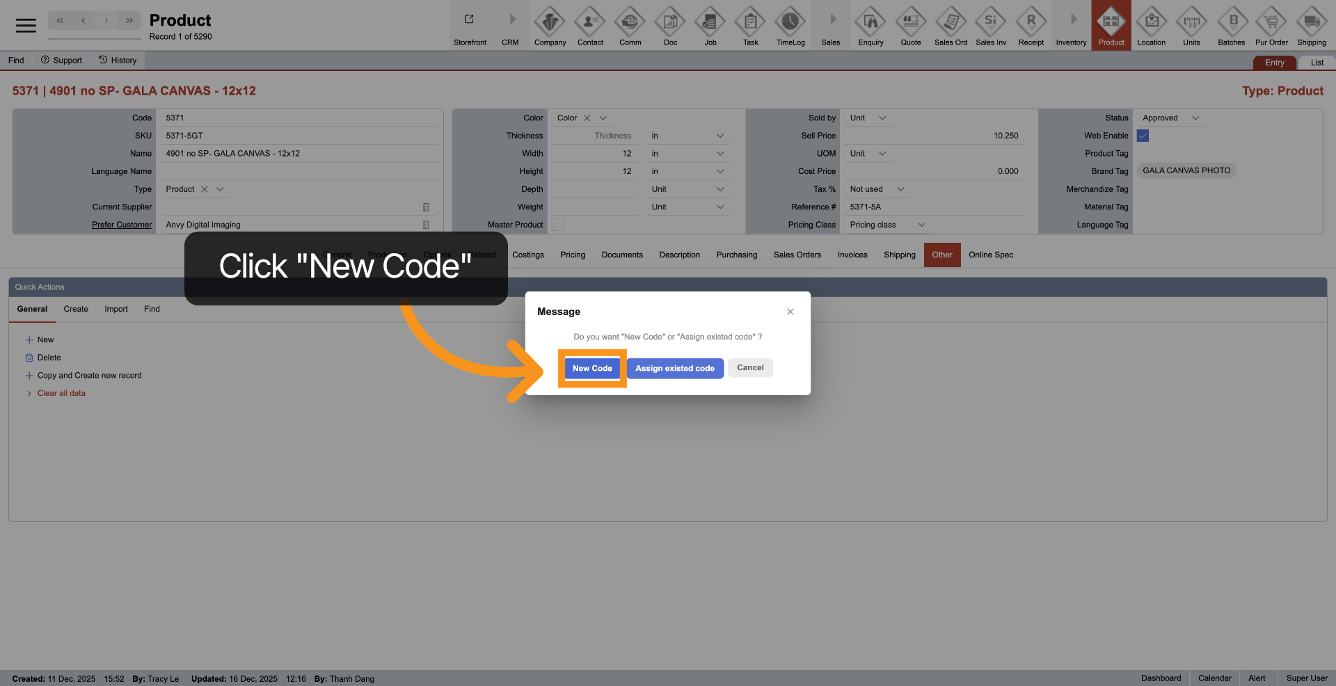 You have two options for creating a product: 1. Use "New Code" to generate a new identifier for the product. 2. Choose "Assign Existing Code" to replace only the deleted code. Now, let’s proceed with creating a new code.