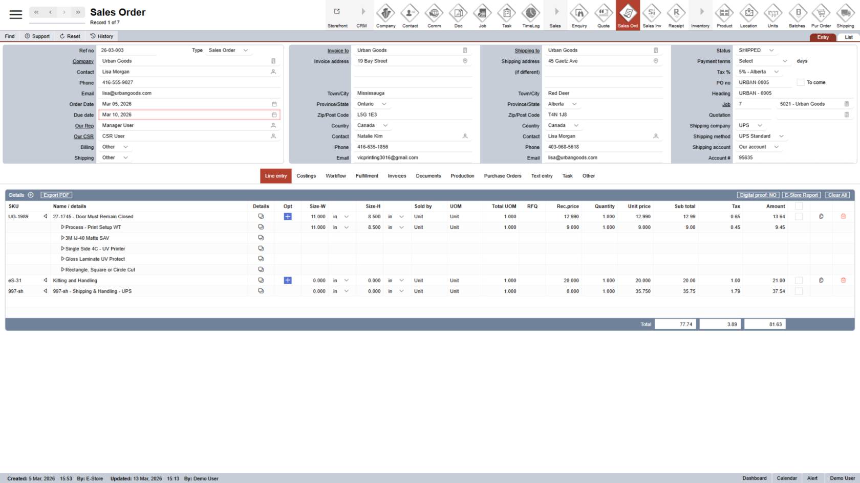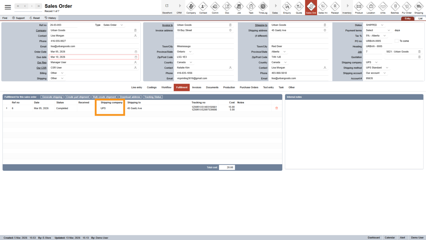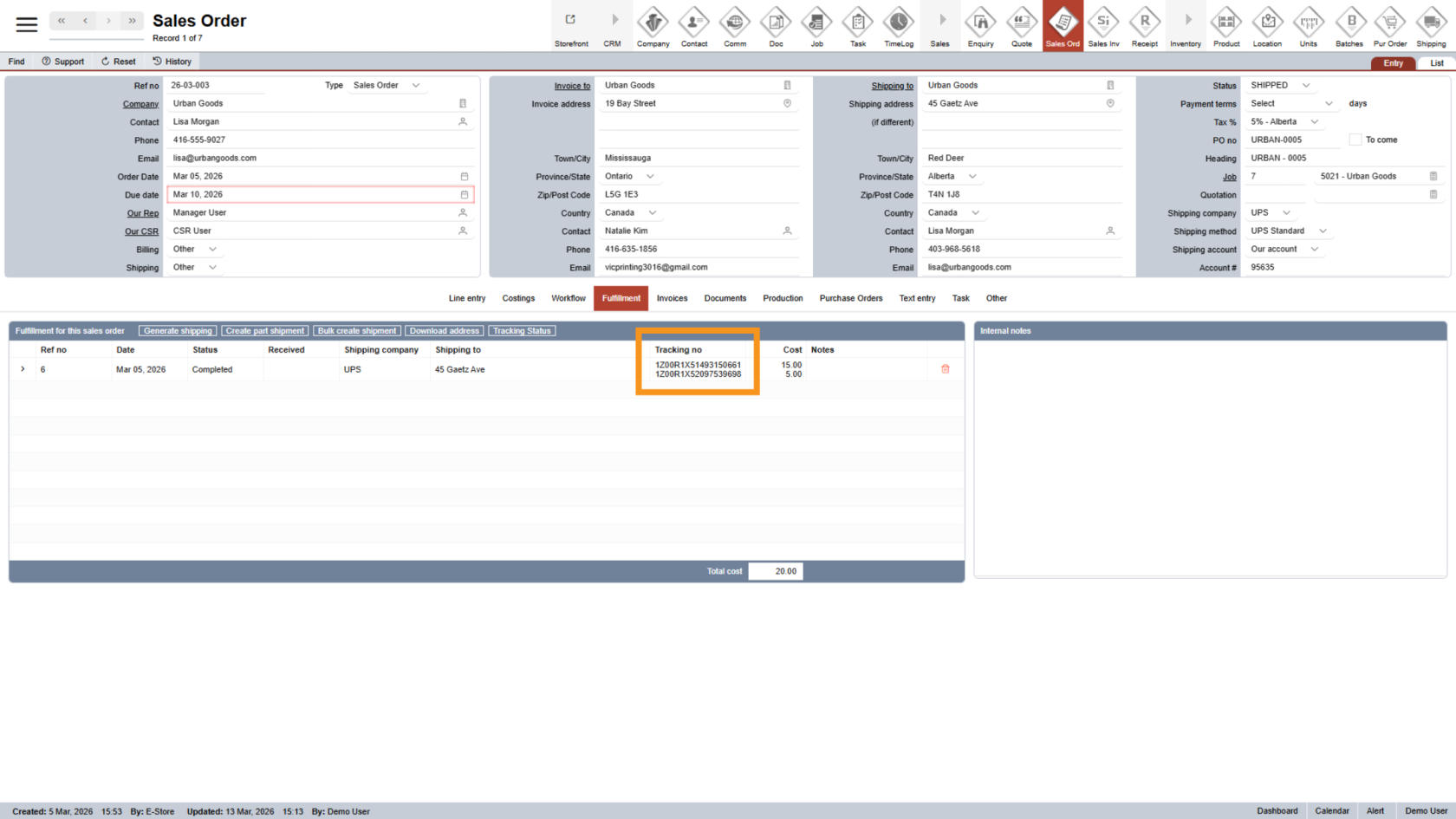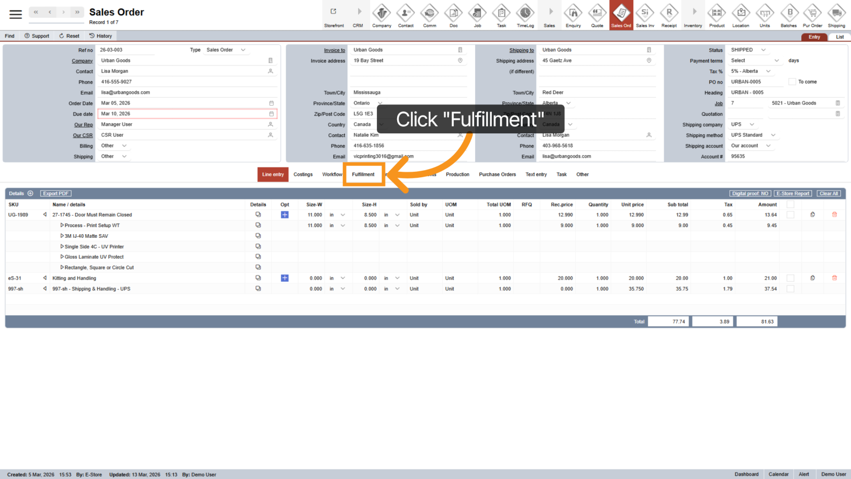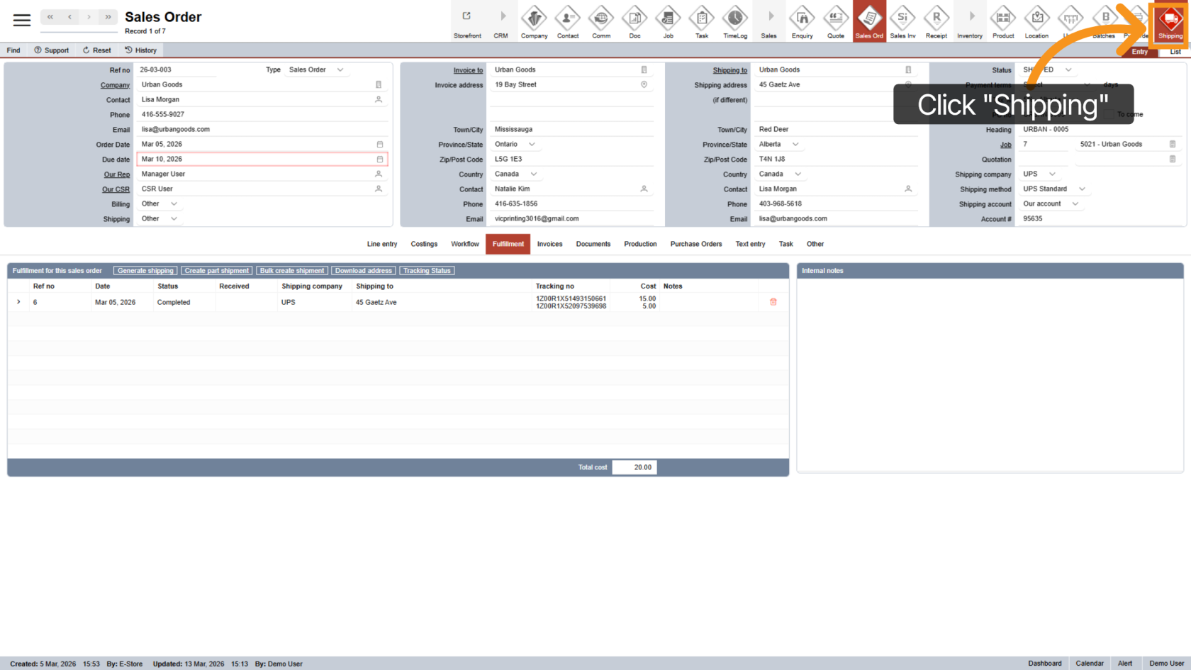 Click the "Fulfillment" tab in the sales order to view the shipping details.