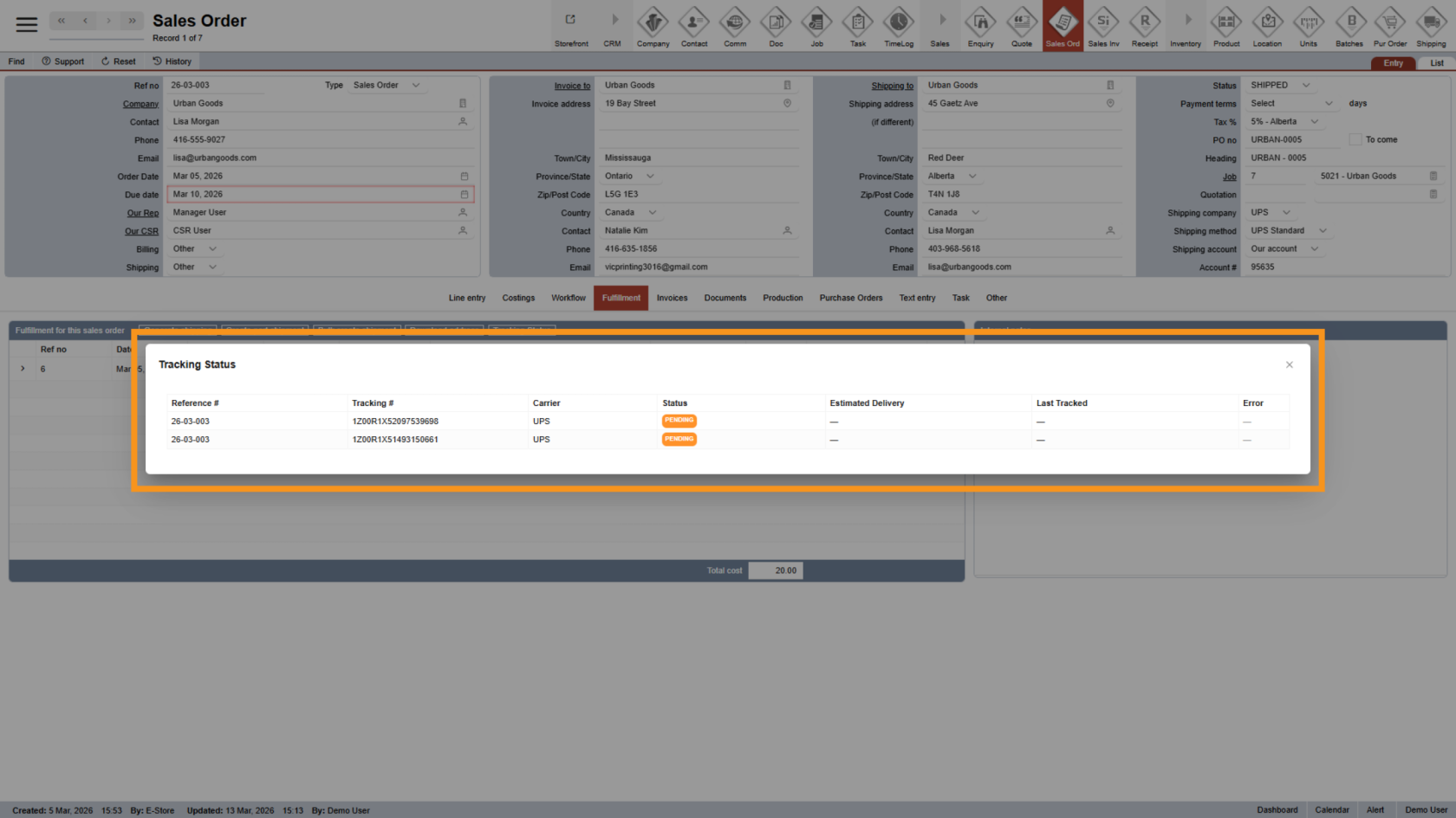 A pop-up will display a summary of all shipments in the sales order, including each package's status.